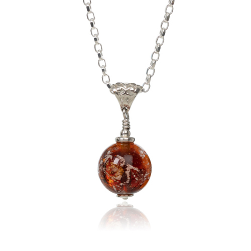 This Cremation glass pendant is made with a rich Amber Murano Glass, the ashes really stand out against the warm colour of this Glass. Like Autumn leaves of golden brown you'll see rich amber shades glow inside, adds a warm glow to any outfit.