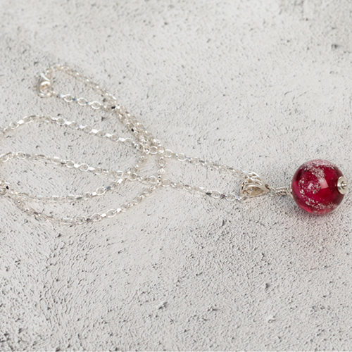 The Fuchsia flower influences the colour for this beautiful cremation glass pendant. The Ashes inside this glass really stand out against the vivid Cranberry colour. This pendant with Ashes inside is full of expression.