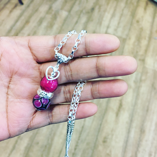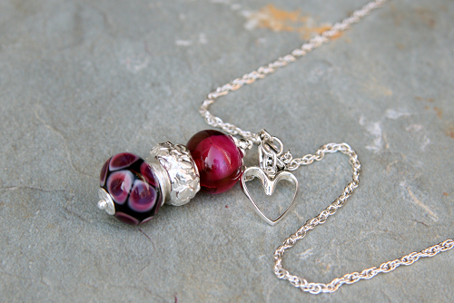 This 18-inch necklace is made up of three cremation glass beads and a silver heart charm.