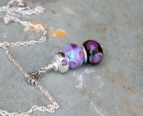 The top bead is a Sterling Silver bead set with four amethyst gemstones, it sits on top of two designer beads, cornflower blue with cranberry and black with cranberry a truly beautiful piece.